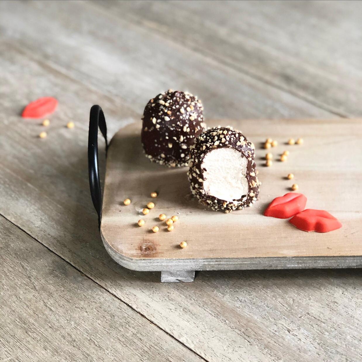 Een chocozoen die genoemd is naar de bekende Ferrero Rocher , een heerlijk zoet schuimvulling met nougat smaak. de Chocolade Zoen is bestrooid met fijne stukje geroosterde hazelnoot.